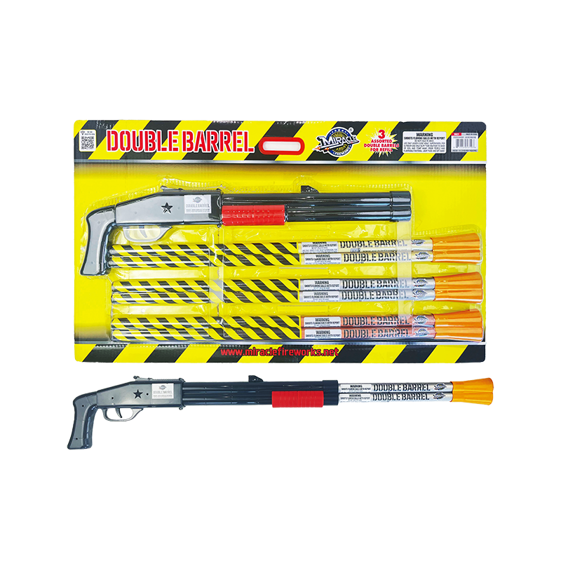 DESCRIPTION: Crowd favorite! Extraordinary double barrel shaped roman candle for fun. Three assorted double barrels for refills. Silver chrysanthemum mine with blue; silver crackling tail; red and green comet tail.